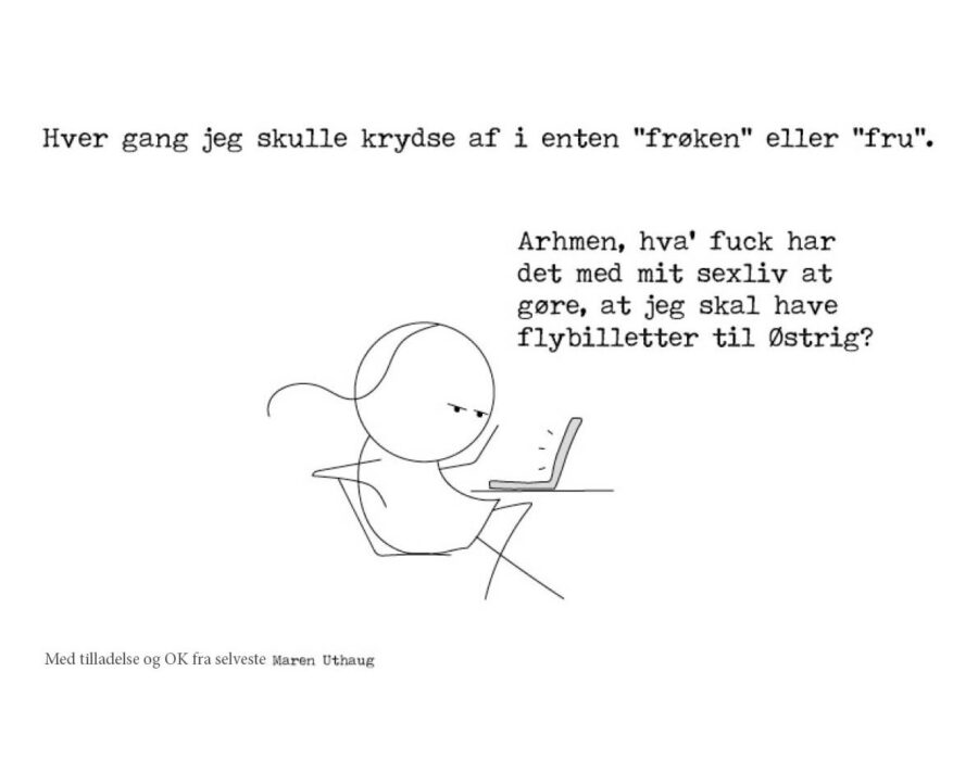 Når vi skal sætte en titel foran vores navn, så er det for kvinder afgørende om vi er gift. Mænd er hr., uanset civilstatus eller alder. Det er et levn fra gamle dage, bevares. Jeg kender historien. Men diskussionen er næsten ligeså lang. Allerede i 1910 drøftede Dansk Kvindesamfund første gang at droppe frøken som titel, og i dag omtales alle kvinder i eksempelvis Folketingssalen for Frue – uanset civilstatus.